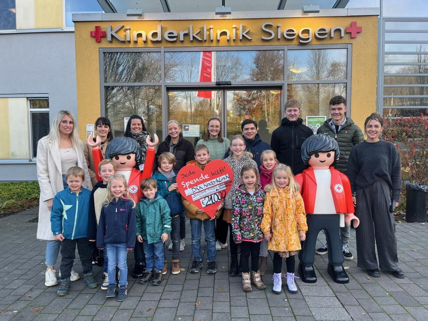 So viel Geld haben wir für die DRK-Kinderklinik Siegen erlaufen - gemeinsam mit den Vorschulkindern aus der Kindergarten-Uni Unterm Regenbogen, dem Familienzentrum Kleine Strolche Altenhof, dem Ottfinger Dorfnest und einigen Schülervertreter:innen der Franziskusschule Olpe. Ein herzförmiges Schild mit dieser beeindruckenden Zahl brachte jetzt eine kleine Delegation in Siegen vorbei, stellvertretend für alle Läuferinnen und Läufer. Mit von der Partie waren auch die Klassensprecher-Kinder der Waschbären und der Erdmännchen und ihre Lehrerin Anna-Lena Dause. Unser Jahrgang 3 hat nämlich einen nicht unbeträchtlichen Teil zur Spendensumme beigetragen