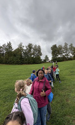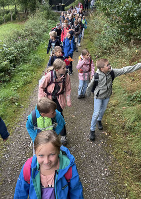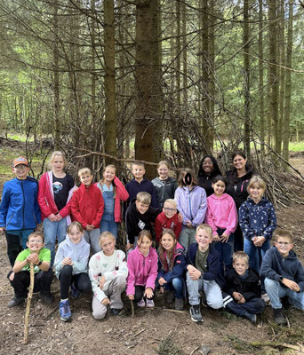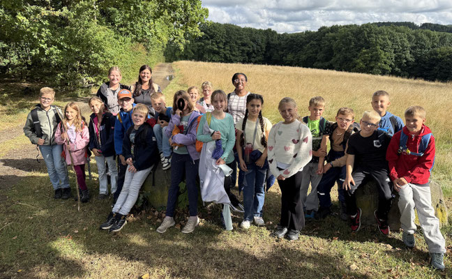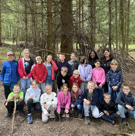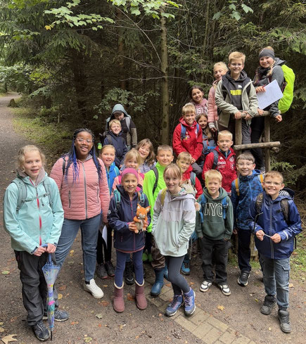 Am 17.9.25 machten sich alle Füchse und Eichhörnchen mit dem Bus auf den Weg nach Olpe zum Waldweg „Grenzenlos“. Dort empfing uns Försterin Frau Knoop und erklärte uns kurz den Ablauf. Auf dem Rundweg erwarteten uns verschiedene Stationen, an denen wir in Gruppen verschiedene Aufgaben erledigen mussten. Unter anderem mussten wir Baumarten bestimmen, Jahresringe an Baumscheiben zählen, Gerüche erraten, die Gerichtseiche ausmessen und ein Elfchen schreiben. Zudem erklärten uns zwei Waldarbeiter, welche Arbeitskleidung sie benötigen und was ihre Aufgabenbereiche sind. Im Schutzhäuschen erwartete uns eine Ausstellung von ausgestopften Tieren. Hier erfuhren wir mehr über diese Waldbewohner und ihre Lieblingsnahrung. Da wir an dieser Station leider sehr lange warten mussten, schafften wir nicht mehr alle Stationen und mussten die letzten Meter richtig doll rennen, um noch unseren Bus zurück nach Hünsborn zu bekommen. Als Belohnung bekam noch jedes Kind eine Urkunde und die Klasse den Baum des Jahres, die Rotbuche, geschenkt.