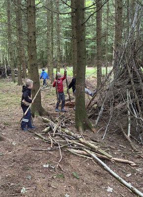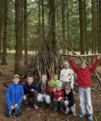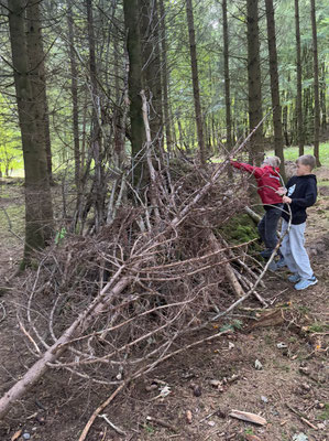 Dienstag weckte uns Frau Schmidt um 7 Uhr mit unseren Lieblingsliedern. Anschließend ging es zum Frühstück und danach in den Wald. Im Wald bauten wir riesige Tipis. Gemeinsam trugen wir ganz große Baumstämme und richteten die Tipis gemütlich ein.
