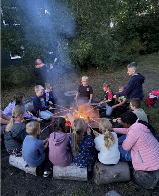 Wir kamen an und bauten alles auf. Dann aßen wir zu Abend. Wir gingen nach draußen. Manche sahen Rauch aufsteigen und holten Frau Schmidt. Dann lasen wir "Jacky Marrone". Viele warteten bis es dunkel wurde und machten eine Nachtwanderung. Die anderen spielten und machten sich fertig. Dann schliefen alle. Am Morgen war Noahs und Louis Geburtstag und alle aßen Frühstück. Wir räumten alles auf und dann wurden alle schon abgeholt. Ich fand es besonders toll, dass nicht alle mit zur Nachtwanderung mussten.